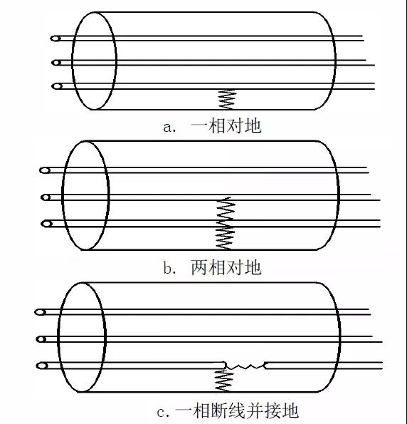 電纜故障從型式上可分為串聯與并聯故障。串聯故障指電纜一個或多個導體(包括鉛、鋁外皮)斷開;通常在電纜至少一個導體斷路之前,串聯故障是不容易發現的。并聯故障是導體對外皮或導體之間的絕緣下降,不能承受正常運行電壓。實際的故障型式組合是很多的,圖1給出了可能性較大的幾種故障形式。例如:圖1.c所示,導體斷路往往是